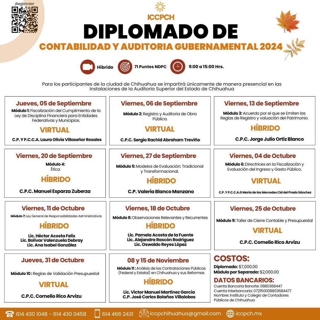 ¡Buenas noticias! Diplomado de Contabilidad y Auditoria Gubernamental 2024 11 módulos con un total de 71 punto NDPC No te pierdas la oportunidad de aprender de la mano de los grandes expertos Registrate: LINK: https://forms.gle/Gyks1ZkNg1Yc8hP28… TEL: 614-430-04-58 WPP: 614-466-24-31